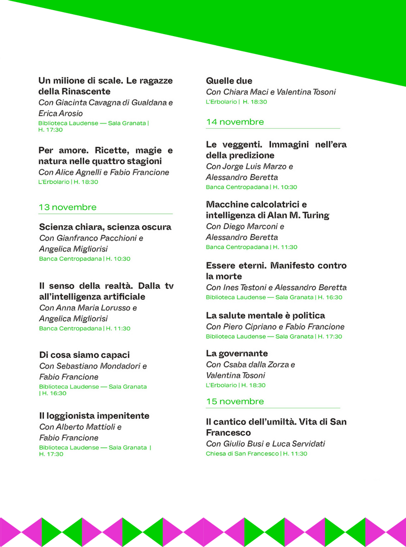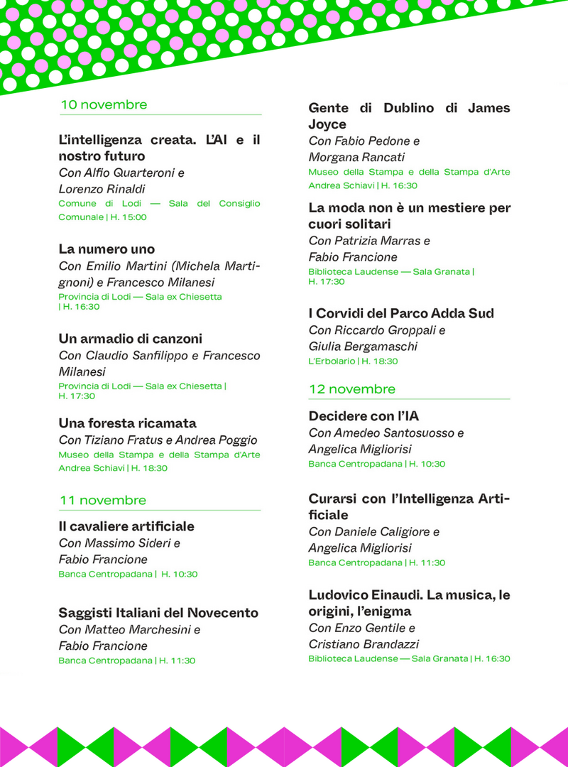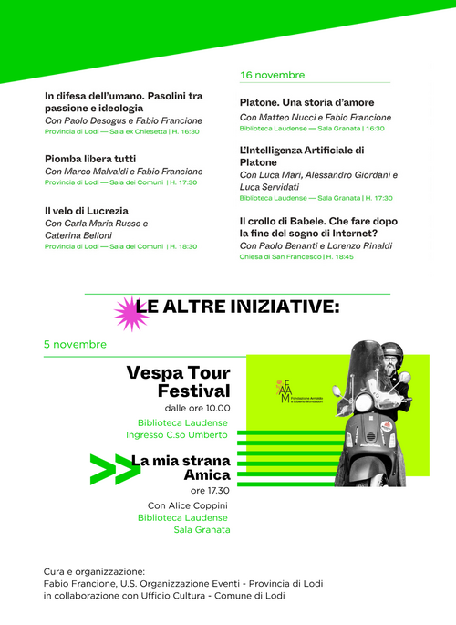 «Siamo onorati di collaborare per il secondo anno consecutivo a un’iniziativa prestigiosa quale BookCity Milano, che, dopo l'esperienza positiva del 2023, ha deciso di confermare il coinvolgimento di Lodi nella rassegna. Il programma, costruito in stretta sinergia con il Comune di Lodi, offre un ampio ventaglio di stimoli multidisciplinari in grado di suscitare l'interesse di un pubblico vasto e diversificato. Gli incontri spaziano tra prosa, poesia, narrativa e saggistica, offrendo agli appassionati e ai curiosi la possibilità di costruire un proprio personale itinerario tra le suggestive location della città, tutte facilmente accessibili. È un’occasione per scoprire Lodi sotto una nuova luce, attraverso un circuito culturale che valorizza la vicinanza dei luoghi e la loro identità».