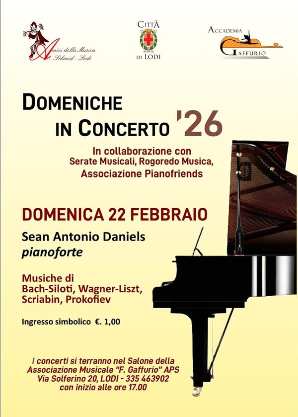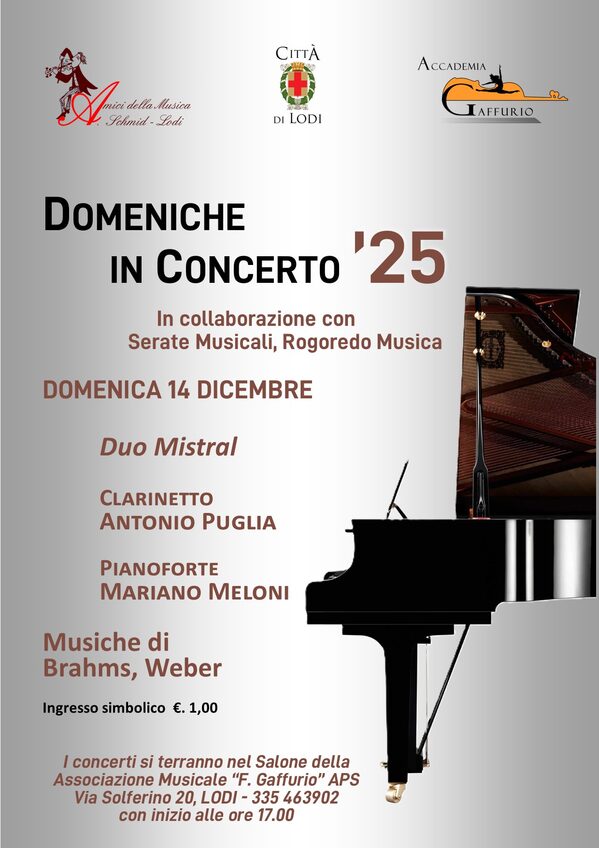 I concerti si terranno nel salone dell'Associazione Musicale "F. Gaffurio" APS, con inizio alle ore 17.00, una domenica al mese a partire da settembre 2025 e fino a giugno 2026.