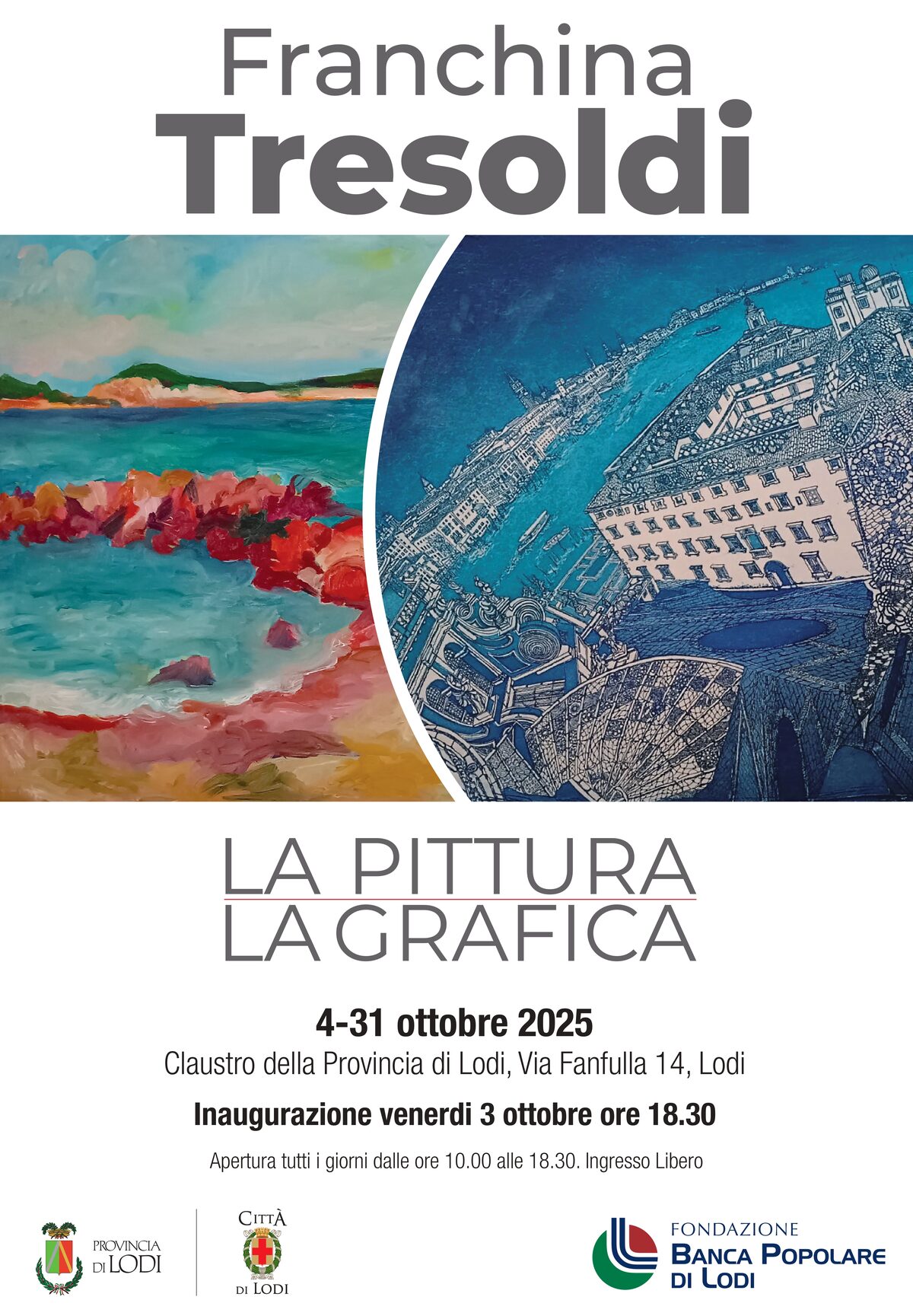Un periodo di decenni di produzione artistica (e di connessa elaborazione creativa) rappresenta un banco di prova ai limiti dell’arduo per chi è chiamato a prodursi nell’impresa di una curatela capace di conciliare con equilibrio l’esigenza di sintesi e l’efficacia di rappresentazione. La consapevolezza di quanto ciò costituisca un nodo di complessa risoluzione può diventare un insormontabile elemento di dissuasione dall’affrontare un impegno di tale portata. Nel caso dell’omaggio che la Provincia si appresta a rendere all’opera di Franchina Tresoldi, nel suggestivo spazio del claustro di Palazzo San Cristoforo, tutto ciò è invece diventato la scintilla di una “sfida” che è stata colta con rispetto, sviluppata con criterio ed affrontata con entusiasmo. E’ un merito da ascrivere a chi se ne è fatto carico con competenza e delicatezza e che al contempo trae presupposto dalla natura della “materia” stessa che è stata trattata e dalla figura così