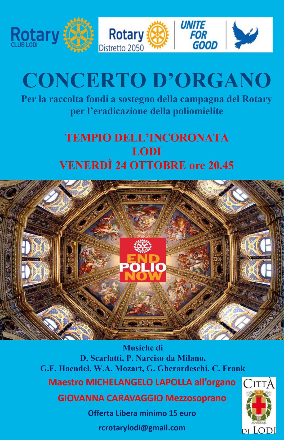 Venerdì 24 ottobre, alle ore 20.45, presso il Tempio Civico dell'Incoronata, il Rotary Club di Lodi propone un concerto d'organo per la raccolta fondi della campagna per l'eradicazione della poliomielite.