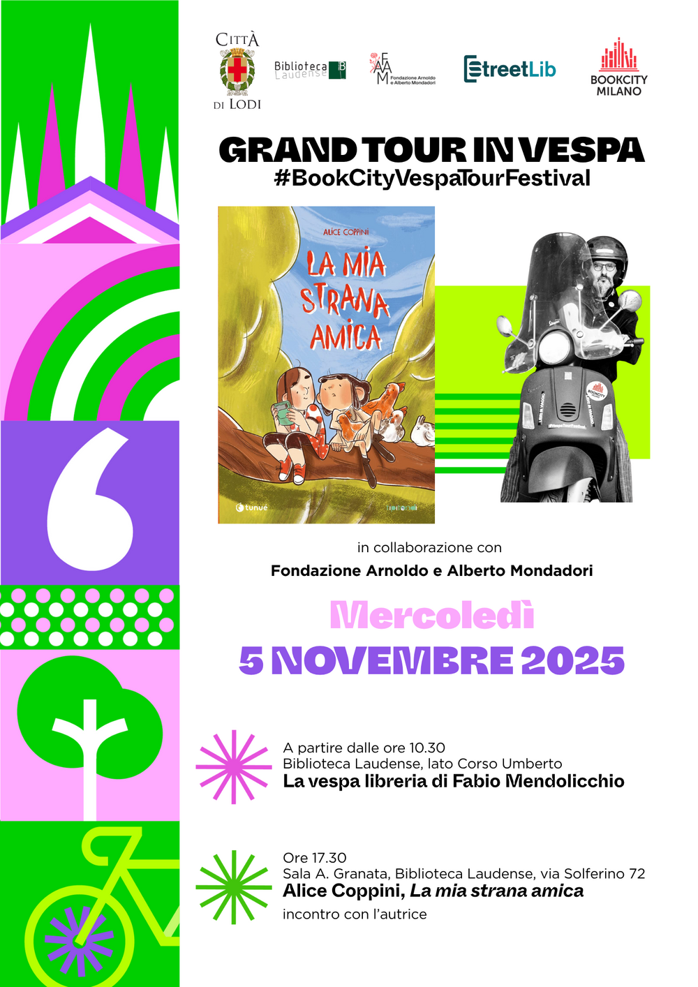 Da sempre, Fondazione Mondadori organizza attività e progetti di promozione della lettura. Non a caso, è tra le fondazioni che nel 2012 hanno dato vita BookCity Milano. Negli anni, la manifestazione ha visto una crescita esponenziale, fino a diffondersi in altre 5 città della Lombardia: Como, Cremona, Lodi, Monza, Pavia. Il Vespa Tour si propone di unire idealmente queste 5 città e Milano, portando libri e autori/autrici nelle diverse piazze coinvolte. La settimana precedente BookCity, infatti, e in vista delle Olimpiadi invernali, Fabio Mendolicchio (fondatore di Miraggi edizioni, libraio in Vespa, chef, creativo) in collaborazione con la Fondazione Arnoldo e Alberto Mondadori e StreetLib, terrà incontri aperti alla cittadinanza. L’obiettivo è quello di organizzare momenti di promozione della lettura, di confronto di idee, di condivisione dei valori della cultura e dello sport.Di seguito, il programma: