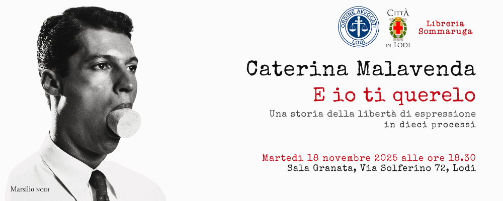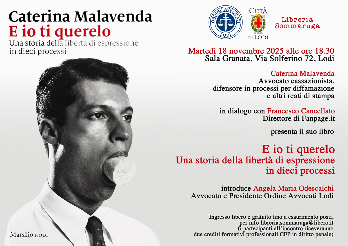 Martedì 18 novembre 2025, alle ore 18.30, in Sala Granata (Biblioteca Laudense) si terrà la presentazione del libro "E io ti querelo" di Caterina Malavenda, avvocato specializzata in difesa per reati di stampa.