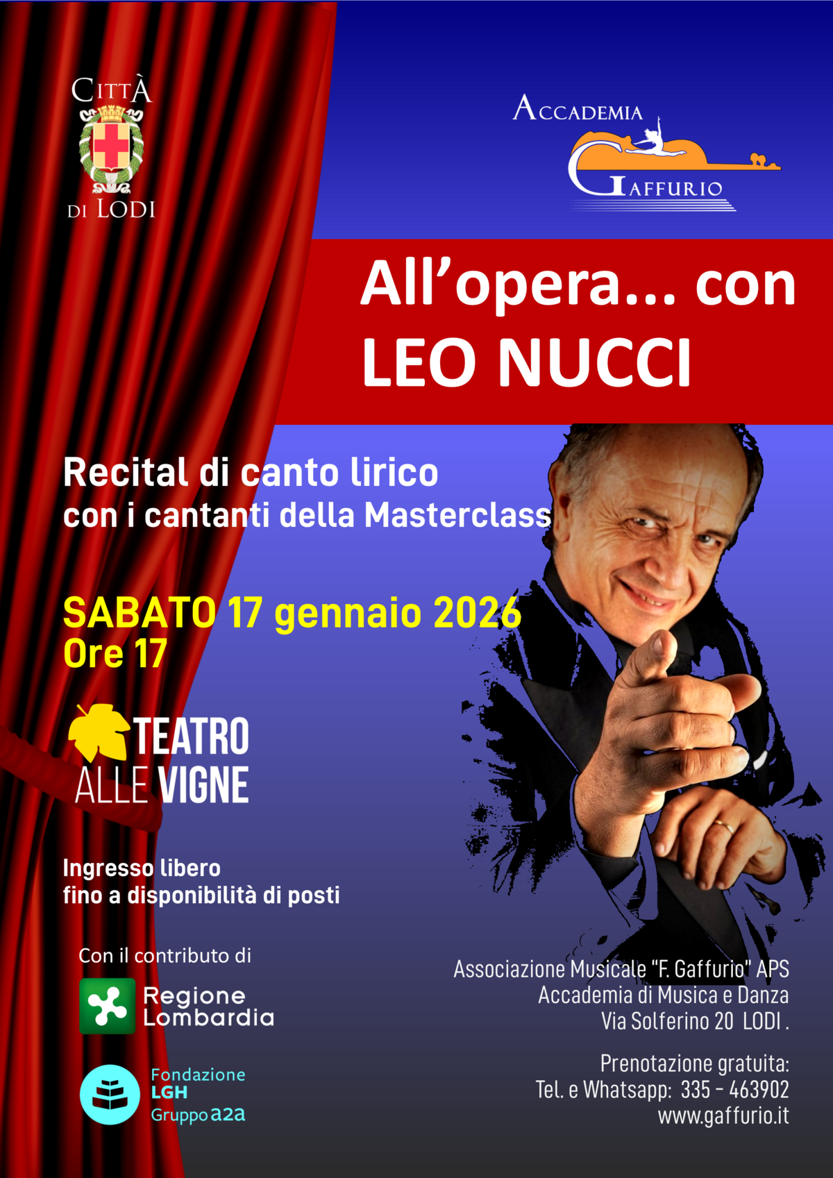 Leo Nucci non ha certo bisogno di presentazioni: è il baritono più famoso del mondo. Questo nuovo concerto alle Vigne è un’occasione unica per un incontro ravvicinato con lui e per apprezzare il suo carisma didattico.