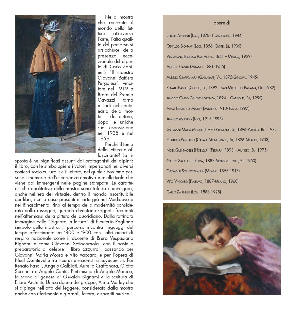 Nella mostra che racconta il mondo della lettura attraverso l'arte, l'alta qualità del percorso si arricchisce della presenza eccezionale del dipinto di Carlo Zaninelli “Il maestro Giovanni Battista Pergolesi”: vincitore nel 1919 a Brera del Premio Gavazzi, torna a Lodi nel centenario della morte dell'autore, dopo le uniche sue esposizione nel 1935 e nel 1959.