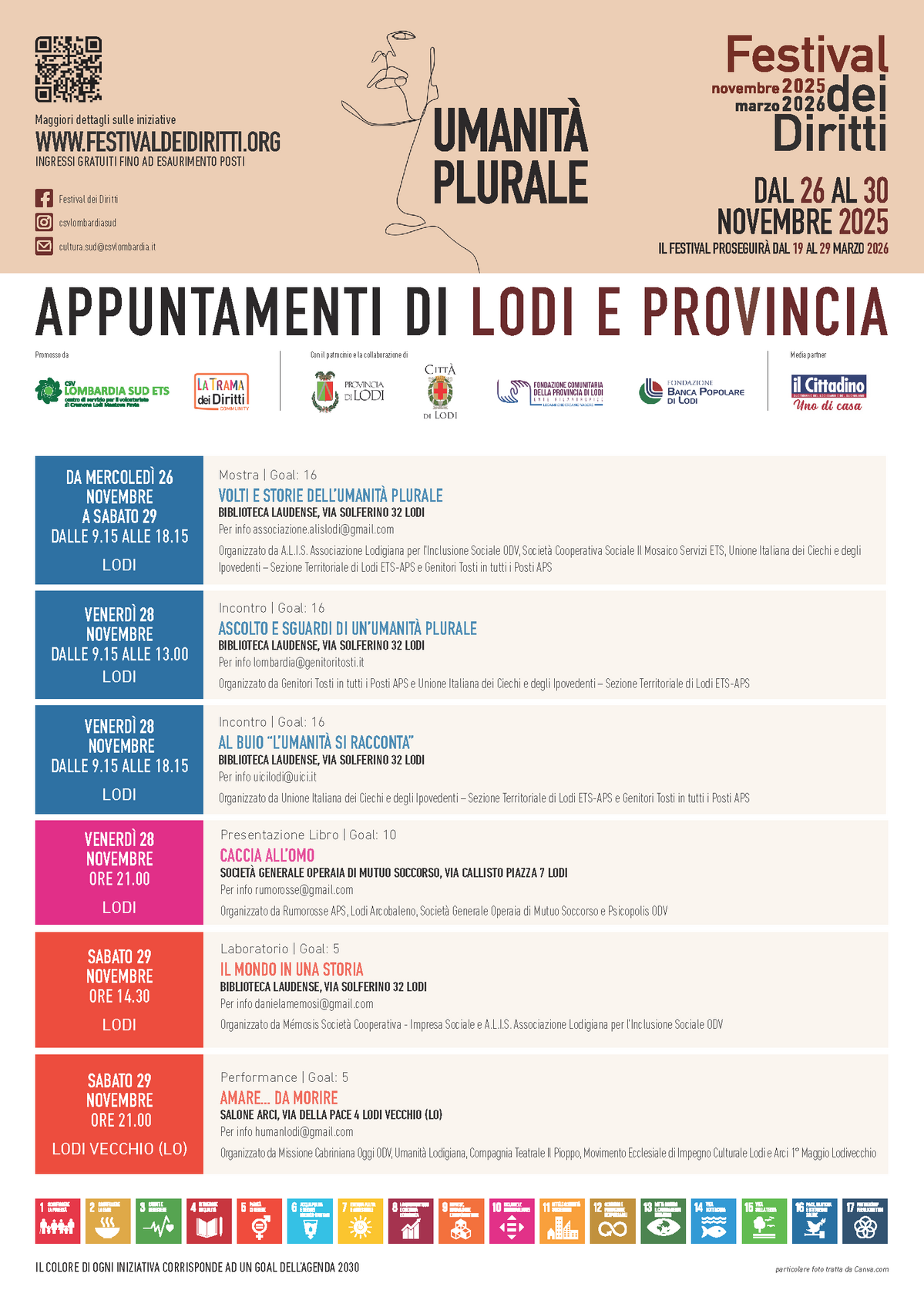 Grazie a 140 realtà coinvolte nella prima tranche della rassegna che si svolgerà dal 26 al 30 novembre 2025, il Festival – giunto alla sua 19ª edizione – intende riaffermare il valore universale della dignità umana, in un tempo in cui i diritti fondamentali, sanciti dalla Dichiarazione Universale dei Diritti Umani del 1948, richiedono di essere continuamente riscoperti e vissuti nella quotidianità. “Umanità Plurale” diventa così un invito a riconoscere e valorizzare la diversità come ricchezza, a costruire comunità inclusive e solidali, a promuovere la pace e la giustizia sociale, in linea anche con gli Obiettivi dell’Agenda 2030 per lo Sviluppo Sostenibile. La seconda tranche del Festival dei Diritti si terrà dal 19 al 29 marzo 2026.