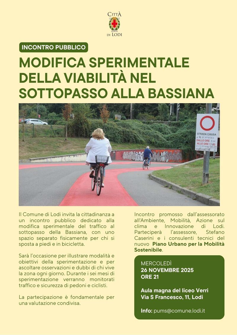 Il Comune di Lodi invita la cittadinanza a un incontro pubblico dedicato alla modifica sperimentale del traffico al sottopasso della Bassiana, con uno spazio separato fisicamente per chi si sposta a piedi e in bicicletta.