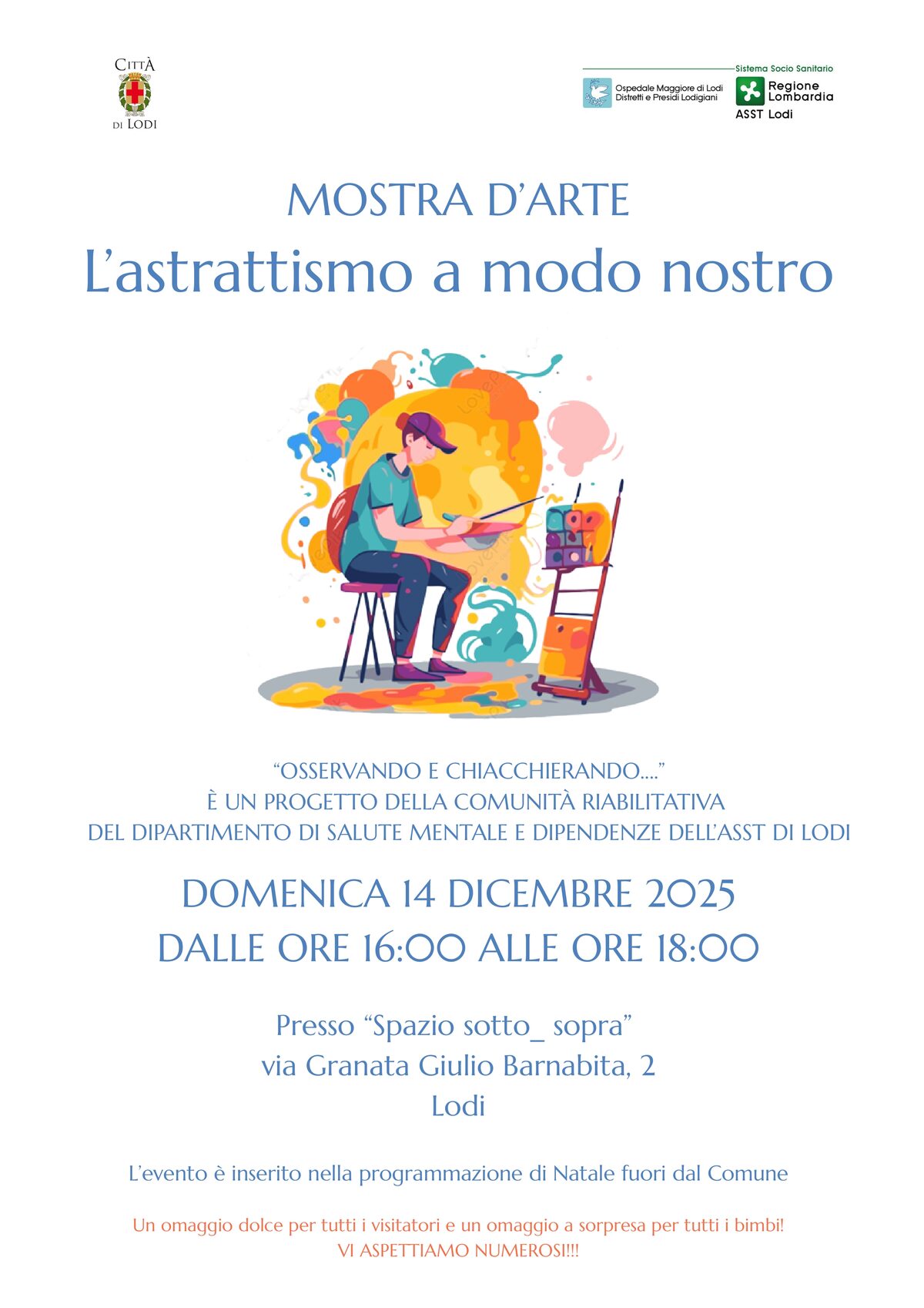 MobilitàDomenica 14 dicembre, dalle ore 16.00 alle ore 18.00, presso lo Spazio sotto_sopra, in via Granata Giulio Barnabita 2, si terrà la mostra L'astrattismo a modo nostro, parte in un progetto della comunità riabilitativa del dipartimento di salute mentale e dipendenza dell'ASST di Lodi. Clicca su approfondisci per scoprire tutti i dettegli.