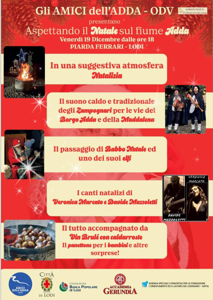 L’Associazione Amici dell’Adda Lodi - ODV è composta da un gruppo di volontari, amici lodigiani uniti dalla passione per il nostro territorio e dal desiderio di far risplendere il fiume Adda come un cuore pulsante della città ripropongono la seconda edizione di "... ASPETTANDO IL NATALE IN RIVA AL FIUME ADDA", attraverso un allestimento natalizio in “Piarda Ferrari” (Albero di Natale, Stella, Presepe, luminarie, ecc.) e l’organizzazione di un evento natalizio, per la giornata di venerdì 19 dicembre.