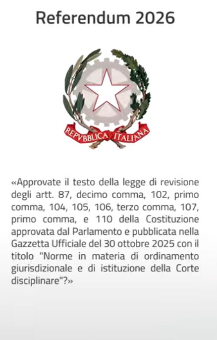 MobilitàIl Presidente della Repubblica ha ufficialmente indetto per i giorni di domenica 22 e lunedì 23 marzo 2026 il referendum popolare confermativo della legge costituzionale recante: «Norme in materia di ordinamento giurisdizionale e di istituzione della Corte disciplinare», approvata dal Parlamento e pubblicata nella Gazzetta Ufficiale della Repubblica italiana n. 253 del 30 ottobre 2025.