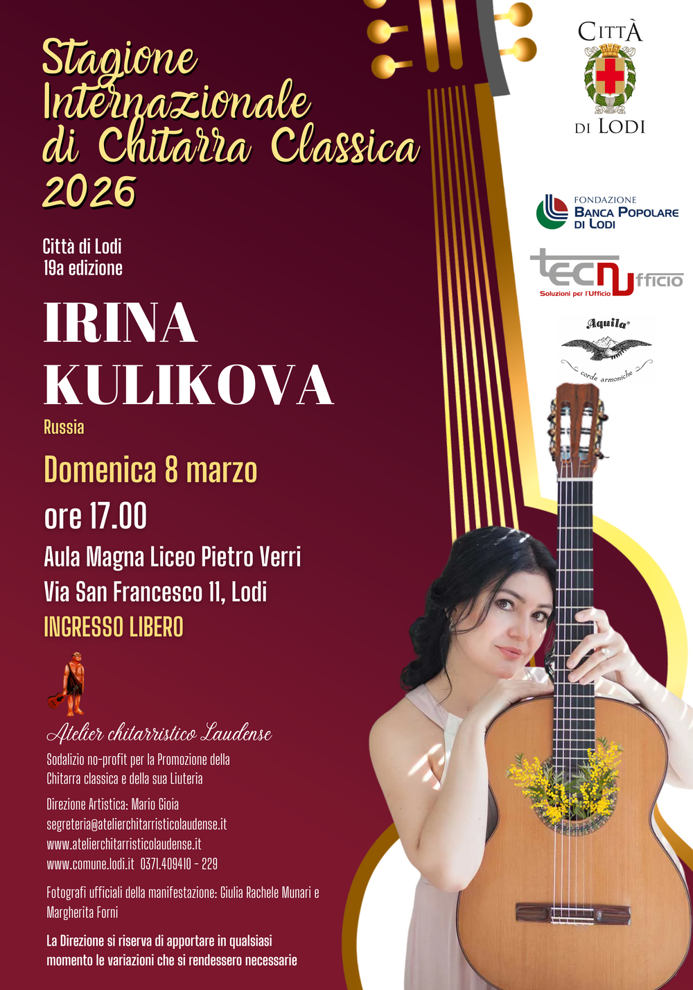 Acclamata per la rara bellezza del suo suono e la sua presenza scenica, Irina Kulikova si è affermata come una delle chitarriste più importanti del momento. È impegnata in tournée in tutto il mondo, con esibizioni nei
