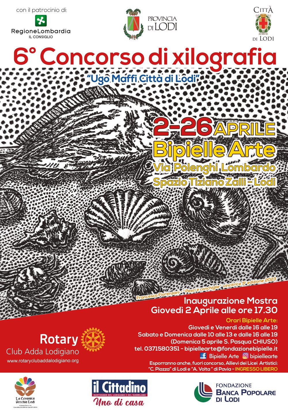 Dal 2 al 26 aprile, gli spazi di Bipielle Arte ospitano il 6° Concorso di Xilografia "Ugo Maffi Città di Lodi", organizzato dal Rotary Club Adda Lodigiano. L'inaugurazione si terrà giovedì 2 aprile, alle ore 17.30.