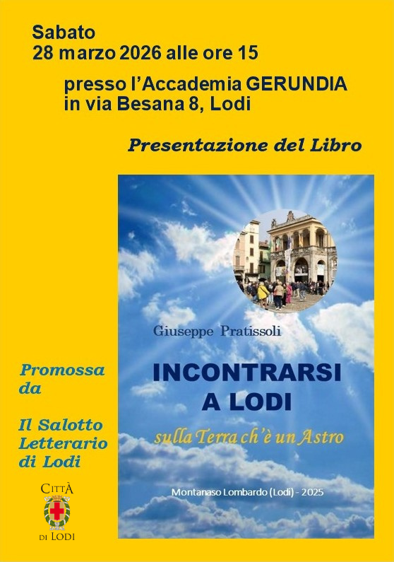 MobilitàSabato 28 marzo, alle ore 15, il tradizionale incontro mensile del Salotto Letterario di Lodi (fondato nel 1980 da Elena Cazzulani e Gilberto Coletto; ora condotto da Alberto Raimondi) presso l’Accademia Gerundia di Lodi, in Via Besana 8, ospita Giuseppe Pratissoli per la presentazione del suo libro INCONTRARSI A LODI sulla Terra ch’è un Astro. Il volume rappresenta la seconda parte di un progetto iniziato con "Lodi è una festa" e che vuole raccogliere cronache popolari, eventi ed incontri che l'autore ha vissuto negli ultimi cinquant'anni e che vedono Lodi protagonista.