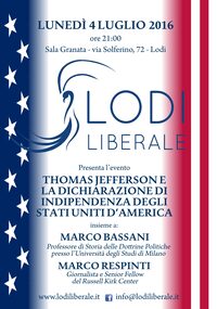 Il Comune di Lodi e l'Associazione Lodi Liberale promuovono lunedì 4 luglio 2016 alle ore 21.00, presso la Sala Granata della Biblioteca Laudense in Via Solferino 72, una serata di approfondimento sul tema Thomas Jefferson e la Dichiarazione d'Indipendenza degli Stati Uniti d'America", insieme a: