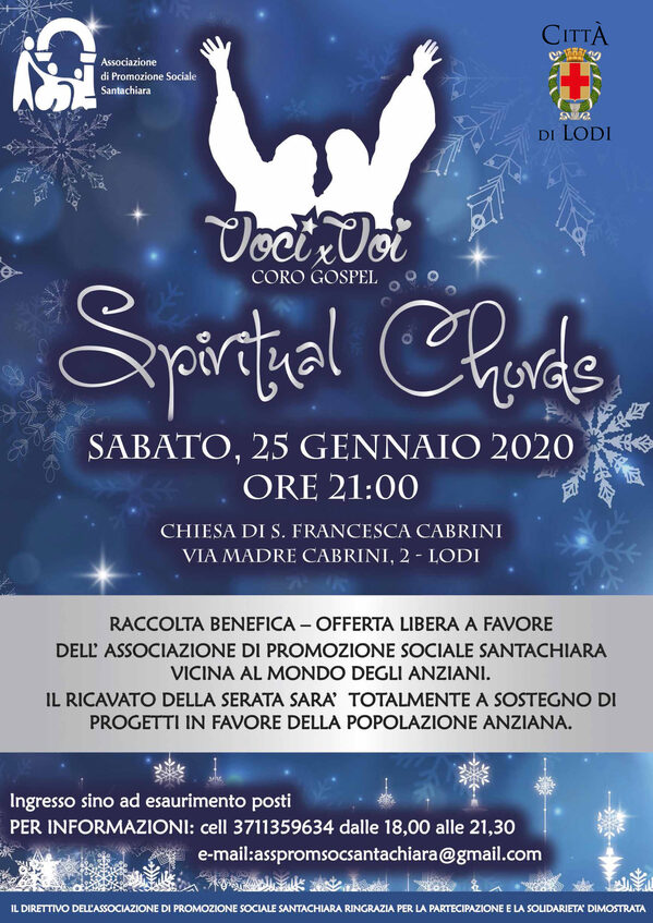 MobilitàIl Comune di Lodi promuove l'evento benefico organizzato dall'Associazione di Promozione Sociale Santachiara che presenta un concerto vocale gospel con il coro Voci X Voi di Melegnano.