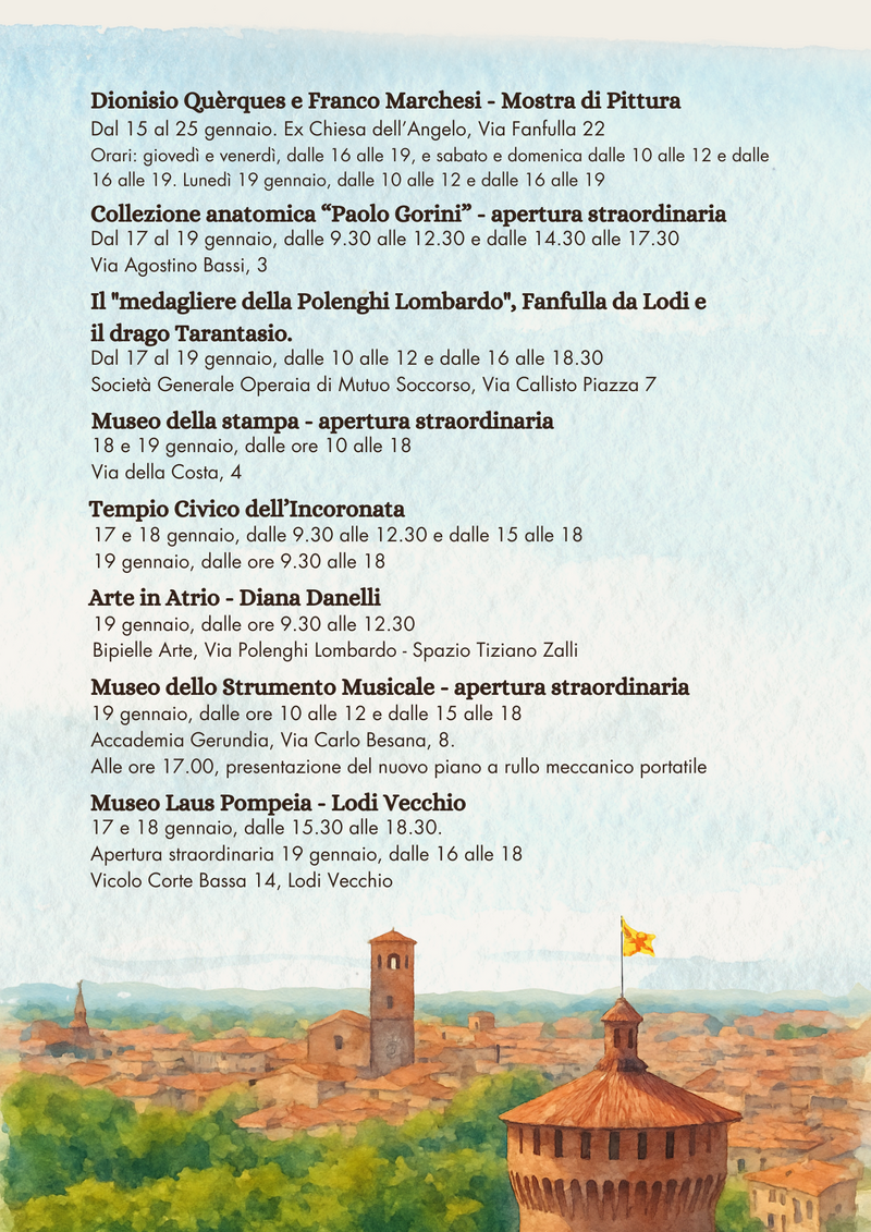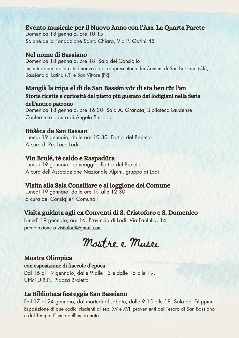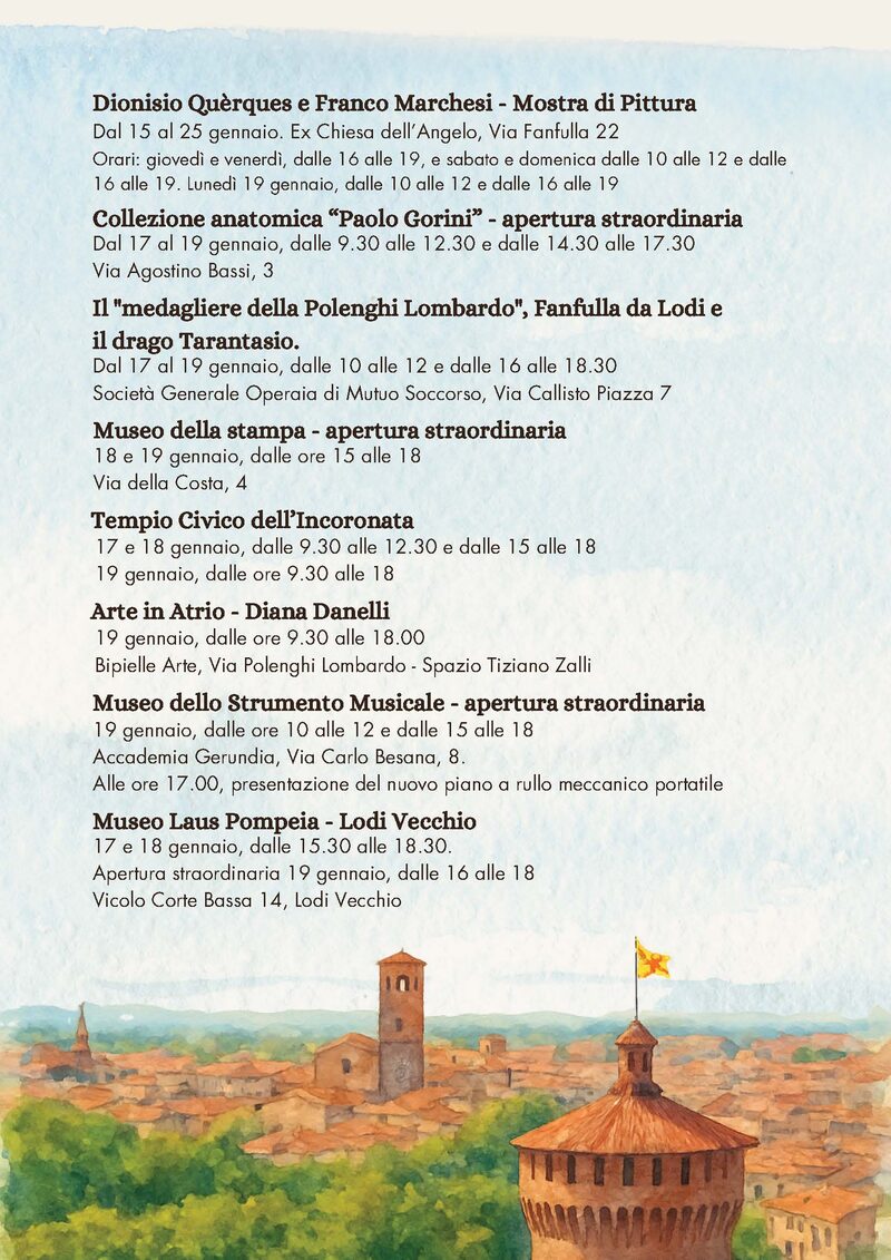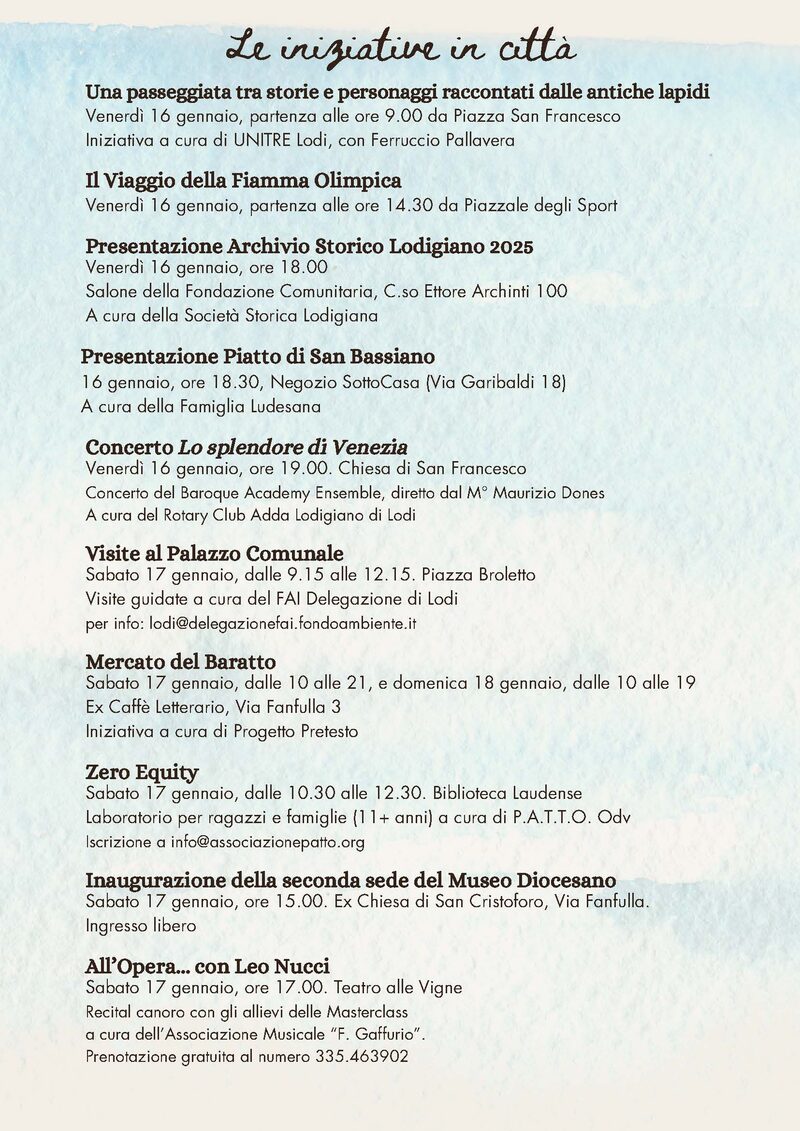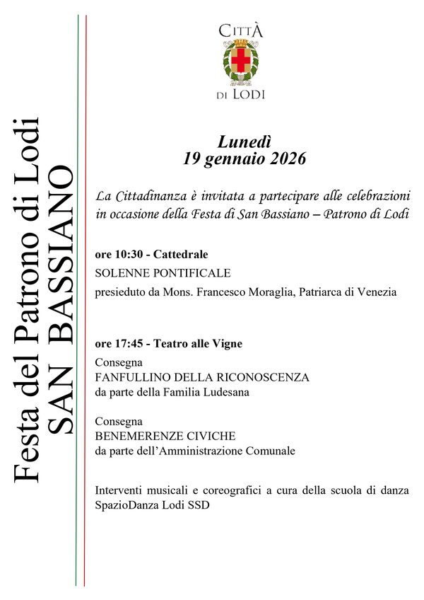 Una Lodi in festa per il suo Patrono che apre ancora una volta le porte per farsi conoscere e ammirare, grazie anche alla collaborazione con enti e associazioni. Un cartellone di eventi che si basa su tradizione, sull'arte e su tanto altro, grazie a un percorso culturale e popolare in programma, tra i più importanti dell'anno per la città.